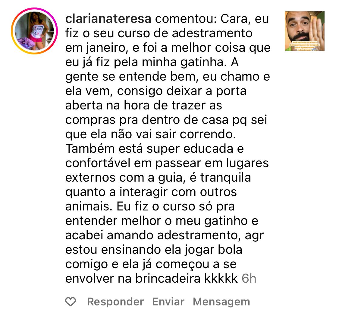 Com profundo conhecimento da fisiologia felina e anos de experiência, criei um método passo a passo que já ensinou mais de 4.000 tutores a treinar seus gatos de forma prática e simples, mesmo em situações desafiadoras.